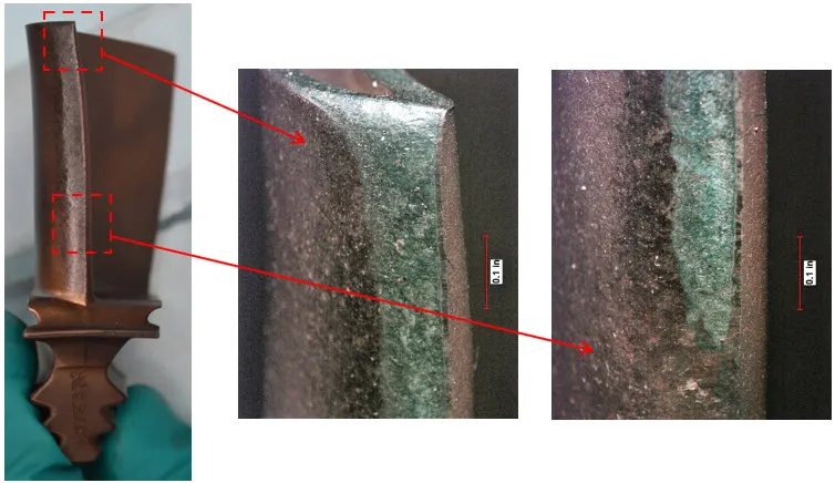 The selected blade exhibited leading-edge material loss common across the blade set. Microscopic examination quantified the depth of missing material and confirmed it remained within allowable blending limits, allowing repair of the remaining blades to proceed.